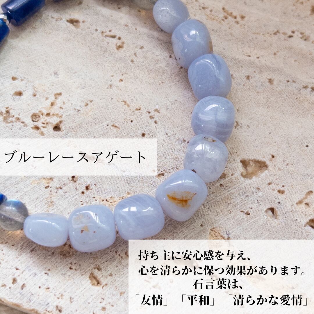深いブルーと柔らかなパステルカラーが調和した、上品で落ち着いた印象のブレスレットです。